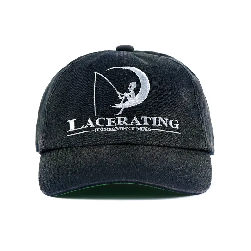 Tap into the eerie energy with the SAINT Mxxxxxx Saint Lacerating 6 Panel Cap. This faded hat features bold embroidery—an alien perched on a crescent moon, fishing into the void. “LACERATING JUDGEMENT MX.6” lands heavy on the front, while “SAINT” locks in the back.