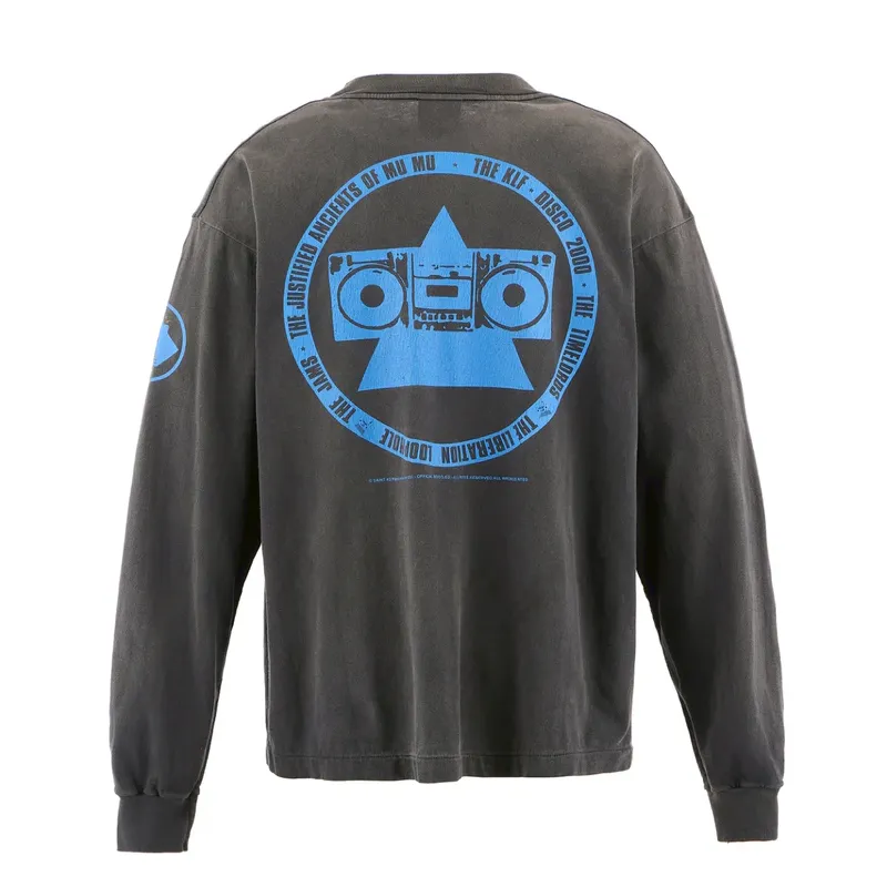 This Black/Blue Saint Mxxxxxx x The KLF Long Sleeve Tee blends underground spirit with sharp street energy. Bold KLF lettering hits the chest, while stacked graphics across the back and sleeve push the design louder. The black and blue tones give it a striking edge that stands out without trying.