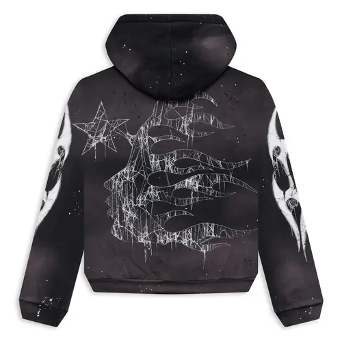 The Black Hellstar Spiderweb Sport Logo Zip-up Hoodie is stylish for cool days. This fleece hoodie features eye-catching “Halloween Spiderweb” graphics on the chest, back, and sleeves. The all-over paint splatters add a bold touch, making it stand out. Its adjustable hood and ribbed trims ensure a snug fit.