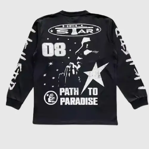 Stand out from the crowd with the Black Hellstar Studios 08 Graphic Long Sleeves. This stylish L/S tee boasts a bold, eye-catching design on the front and back. A large “08” takes center stage on the front, accompanied by a unique Hellstar icon and logo. Turn around to reveal an equally impressive graphic featuring stars, the Hellstar logo, and the phrase “Path to Paradise,” all surrounding an image of a woman. Bold “Hellstar” lettering running down both sleeves completes this striking look.