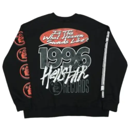 Show off your Hellstar fandom with this Black Hellstar Studios Crewneck Sweatshirt! The back features a question mark and the phrase “Is this what heaven sounds like?” A graphic of a curious kid complements the Hellstar logo on the chest. Both sleeves showcase Hellstar imagery, with the logo and text on the other—crewneck style for a classic look and easy wear.