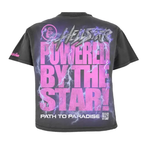 Step into a bold style with the Black Hellstar Studios Powered By The Star T-shirt. The front of this black tee features a dramatic graphic of a skull wearing a helmet with a flaming brain. On the back, bold purple text reads “Powered by the Stars,” placed just below the Hellstar logo and the phrase “Path to Paradise.” It is crafted from soft black cotton, and short sleeves add a rebellious edge to any outfit. Perfect for those who love to make a statement and embrace their inner rockstar.