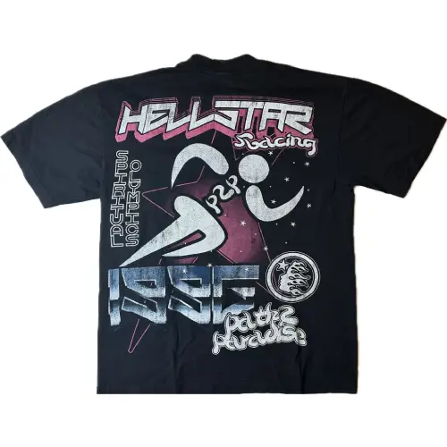 Channel your inner champion with this black Hellstar Studios Spiritual Olympics T-shirt. This tee features “Hellstar, P2P, 1996” and is decorated with a bold red star on the front. On the back, “Spiritual Olympics,” a determined running man finished off with the year “1996” and a red star. It is crafted with soft cotton and offers a breathable feel for daily wear. Elevate your wardrobe with this distinctive piece that combines fashion and bold design.