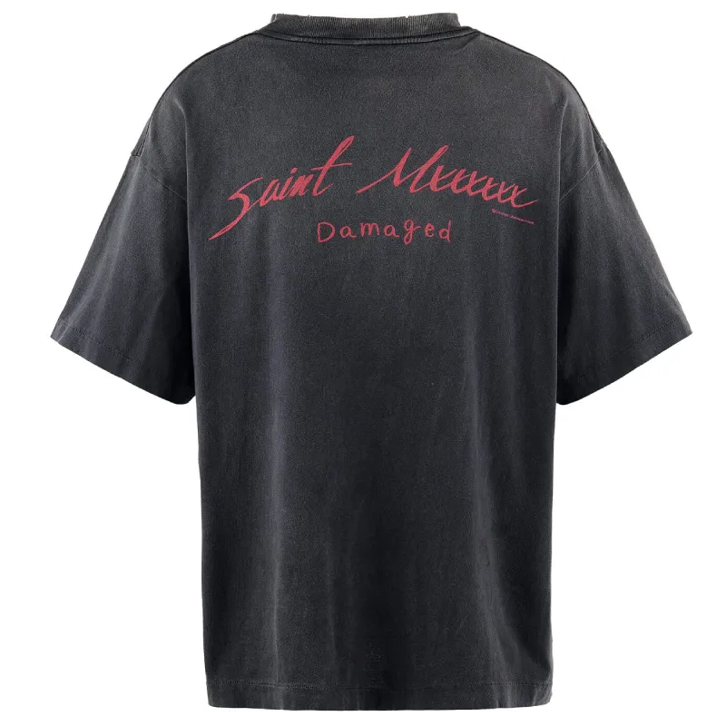 This Black SAINT Mxxxxxx Damaged Short Sleeve Tee is made to turn heads and break rules. Designed with an oversized fit and a washed black finish, it carries a bold attitude in every stitch. The front graphic blends surreal, East-meets-West visuals, while the back features our signature SAINT Mxxxxxx script with a raw “Damaged” statement.
