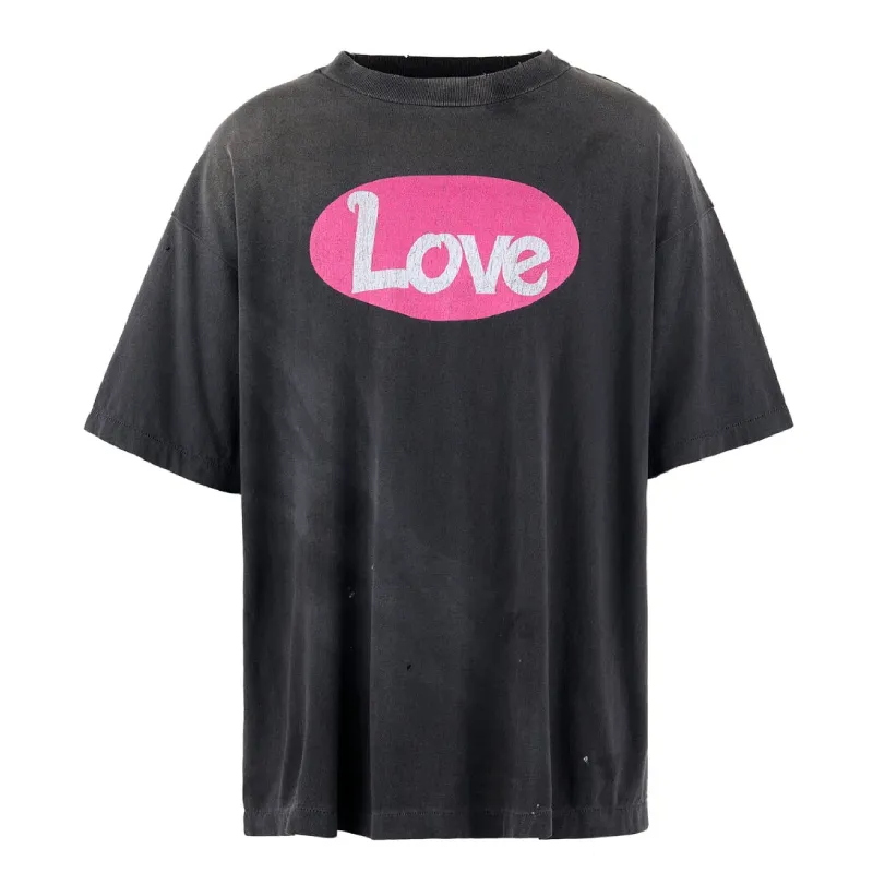 Our Black SAINT Mxxxxxx Very Raunchy Life Short Sleeve Tee makes a sharp statement. Front and back graphics contrast “Love” with raw, darker themes. Likely in washed black, it carries that vintage streetwear edge. The relaxed, oversized fit pairs with a classic crew neck and short sleeves for an easy, standout look.