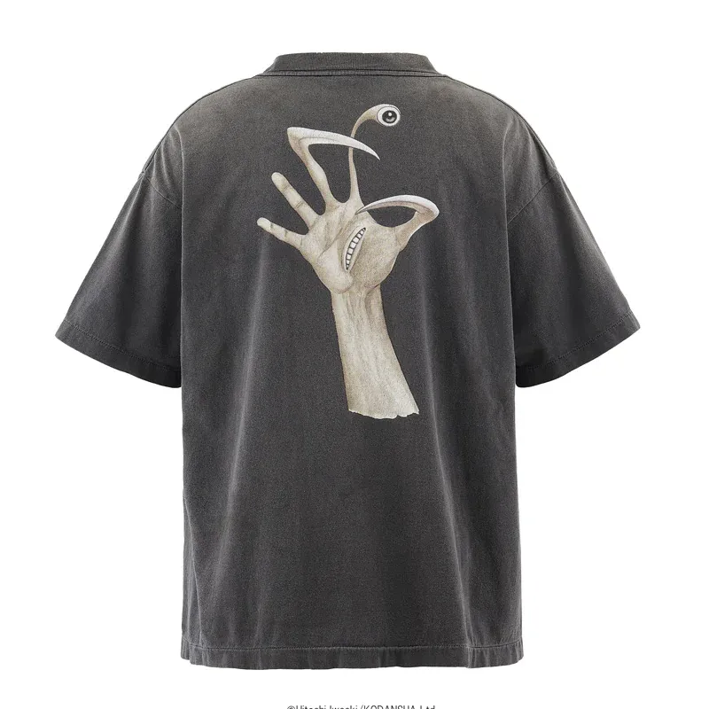 The washed black cotton gives it a vintage feel with abrasions and subtle paint marks. Its back echoes the vibe with another bold hand graphic, keeping the design sharp from both sides. Oversized fit, thick collar, and dropped shoulders complete the grunge-heavy silhouette.