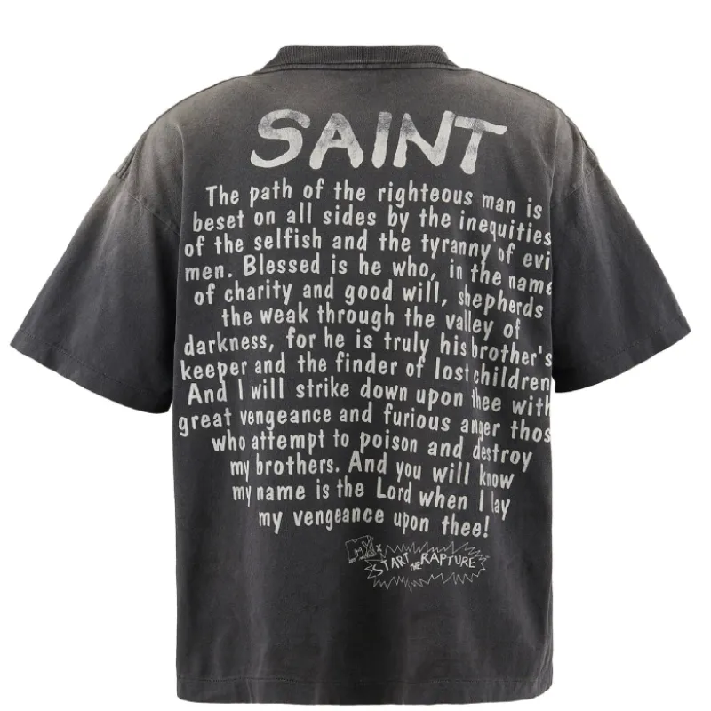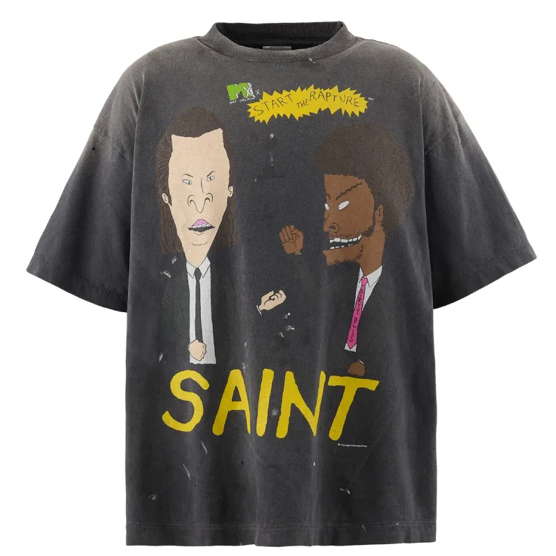 This is the Black SAINT Mxxxxxx Rapture Short Sleeve Tee. We gave it a soft vintage wash and a loose, oversized fit. The front features bold cartoon-style artwork with “Start the Rapture” across the chest. On the back, a loud quote takes over—heavy in message, louder in look.