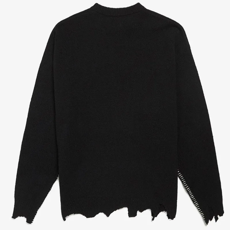 It features distressed cuffs and a frayed hem, adding a rugged, worn-in aesthetic to its bold design. Style it with anything—let the sweater speak for itself.