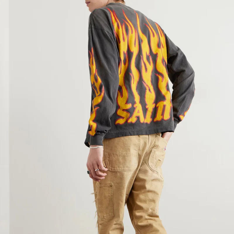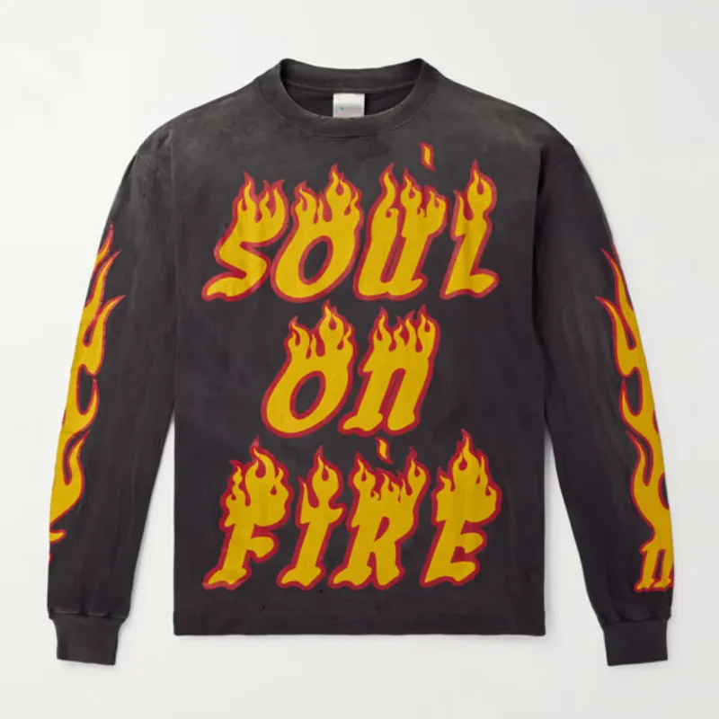 Set your style on fire with the Black SAINT MXXXXXX Soul On Fire T-shirt. Designed with a bold statement print and crafted from premium cotton, this tee combines edge with comfort. The distressed detailing gives it a worn-in, rebellious vibe that’s perfect for making a statement. Whether you’re pairing it with ripped denim or layering under a jacket, this t-shirt speaks volumes without saying a word.
