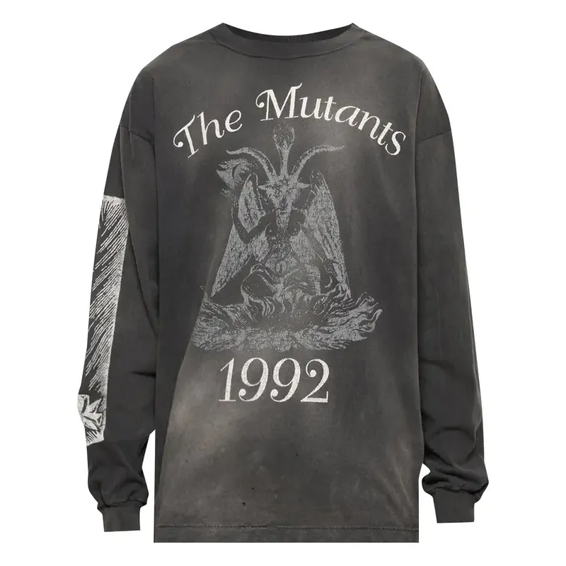 Our Black SAINT Mxxxxxx The Mutants Long Sleeve Tee captures our bold narrative in every stitch. We crafted this heavyweight 100% cotton piece with ribbed collar and cuffs for structure, pairing front, sleeve, and back graphic panels that bring The Mutants story to life. With its vintage‑washed black finish and intentional distressing, each tee is uniquely weathered and expressive. We designed this long sleeve to fit relaxed yet defined—allowing movement, comfort, and attitude.