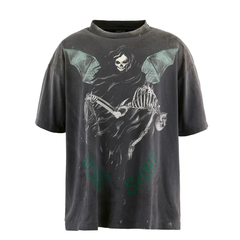 Step into darkness with the Black Saint Mxxxxxx Wicked Saint Short Sleeve Tee. We crafted it from durable black cotton, made to feel strong yet easy to wear. The front hits with a chilling reaper graphic, wings spread, and skeletal form drawn in sharp detail. Across the lower front, “Wicked Saint” cuts through in bold green.