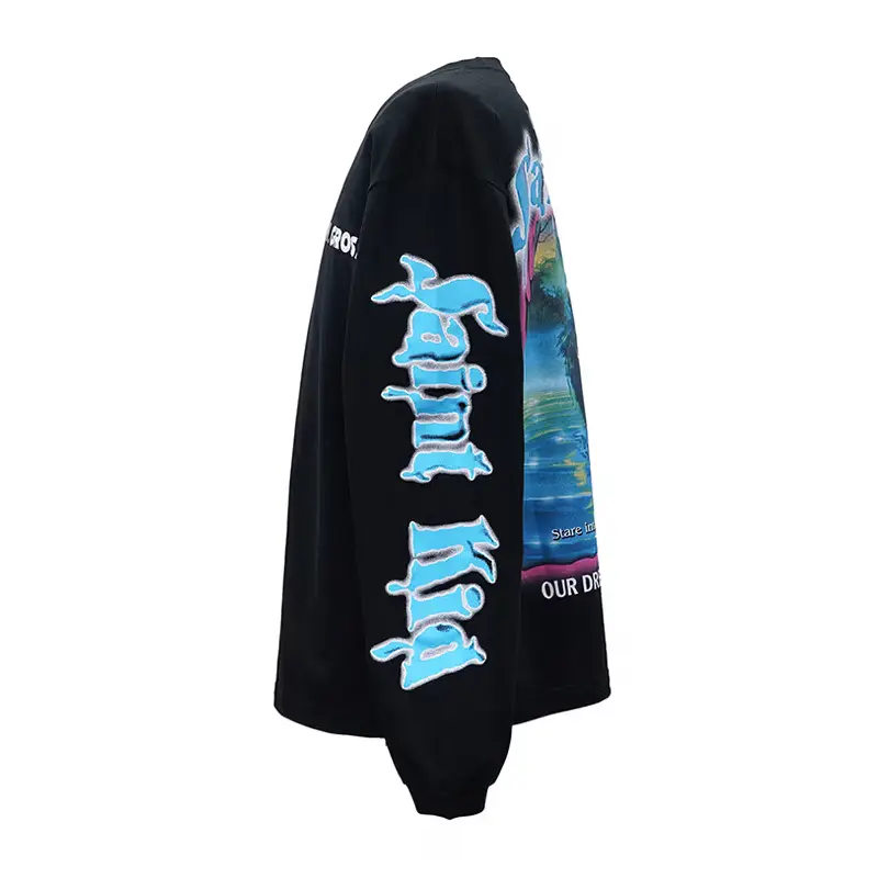 Our Black SAINT Mxxxxxx × Kid LAROI SAINT Kid Long Sleeve Tee makes a strong visual statement through every element. It features a clean black base with “I.M.GROS” printed on the chest. It has blue graffiti graphics running down both sleeves. The back stands out with an oversized SAINT Kid graphic that makes an impact from behind.