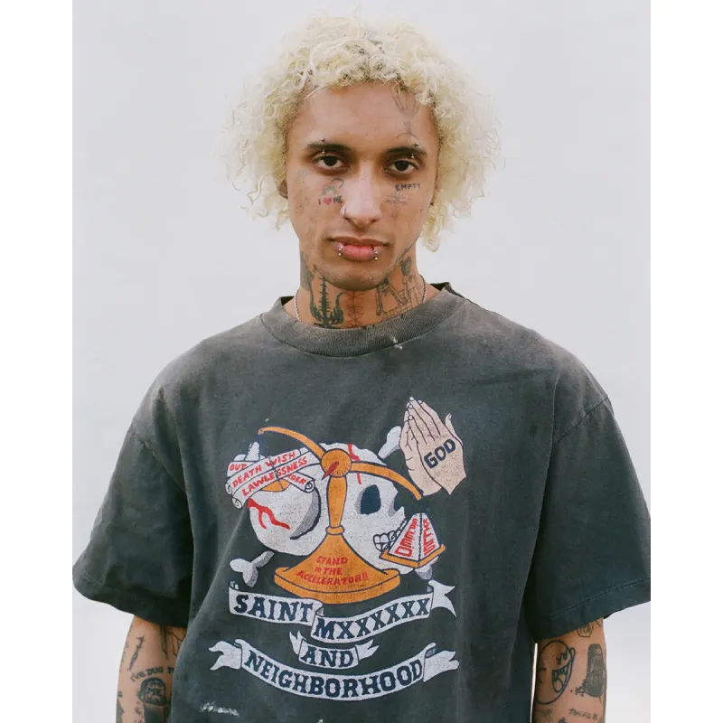Our Black SAINT Mxxxxxx x Neighborhood Pray Short Sleeve Teee is pure streetwear energy. It is made from soft cotton for all-day comfort. The relaxed, oversized fit gives it a bold, laid-back edge. Up front, we drop a complex cartoon graphic framed by the “SAINT Mxxxxxx AND NEIGHBORHOOD” banner — loud and unapologetic.