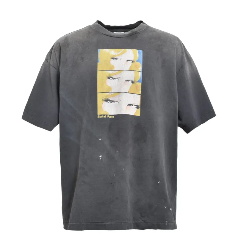 Our Black Saint Mxxxxxx x P.A.M Short Sleeve Tee is made for those who live unapologetically. We blended streetwear attitude with bold pop-art graphics, layering striking eyes across the chest. The black cotton fabric has a vintage-washed finish, giving each tee a unique, lived-in character.