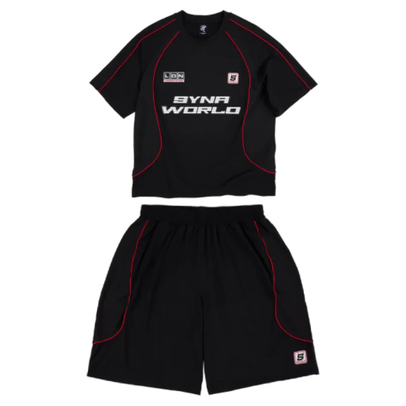 Wrap yourself in this Black SYNA World Perforated Performance Short Set. We designed this cotton set to keep you feeling fresh and relaxed while making a sharp style statement. The oversized tee stands out with striking red piping, a large SYNA WORLD chest print, and signature logo patches for a premium touch.