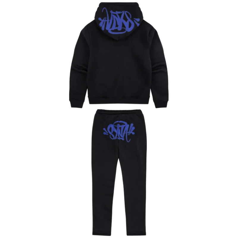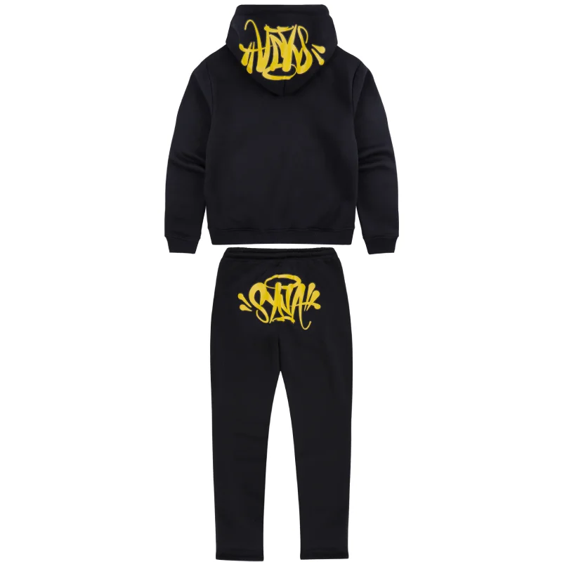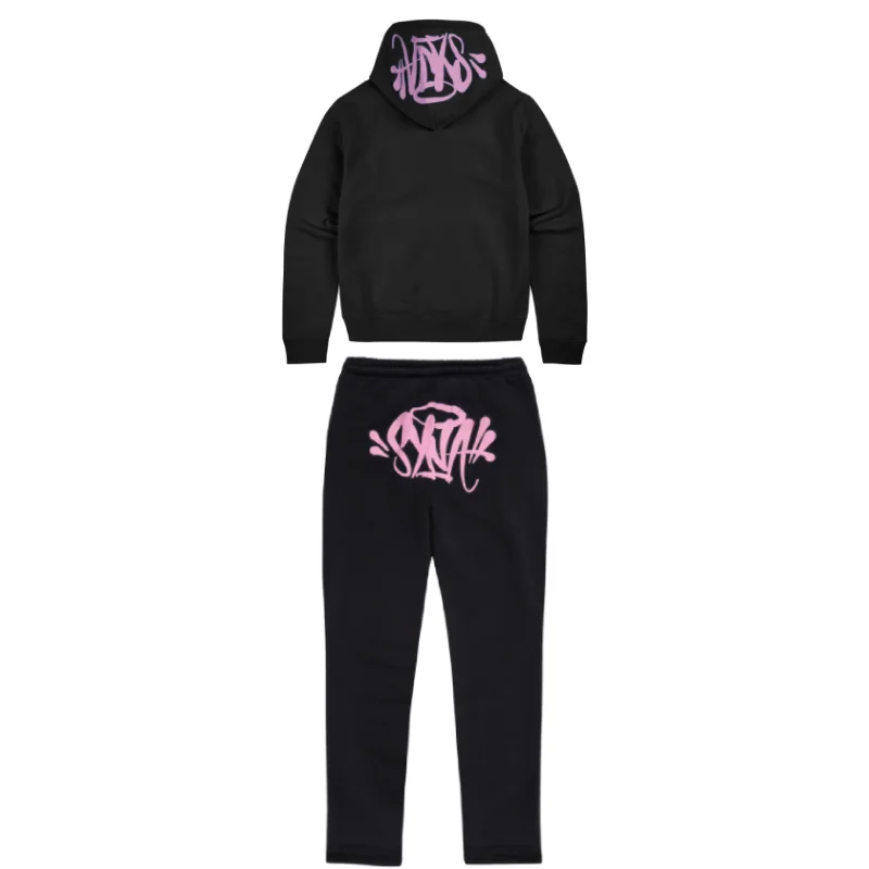 Our Black SYNA World SYNA OG Tracksuit delivers soft structure with a distinct identity. The top has a regular fit in 100% cotton brushback fleece for lasting comfort. Finished with ribbed trims, a kangaroo pocket, and oversized DTM SYNA OG rope laces with metal aglets. The hood shows our screen and puff print logo, while the cuff carries signature “Forgive Me” branding.