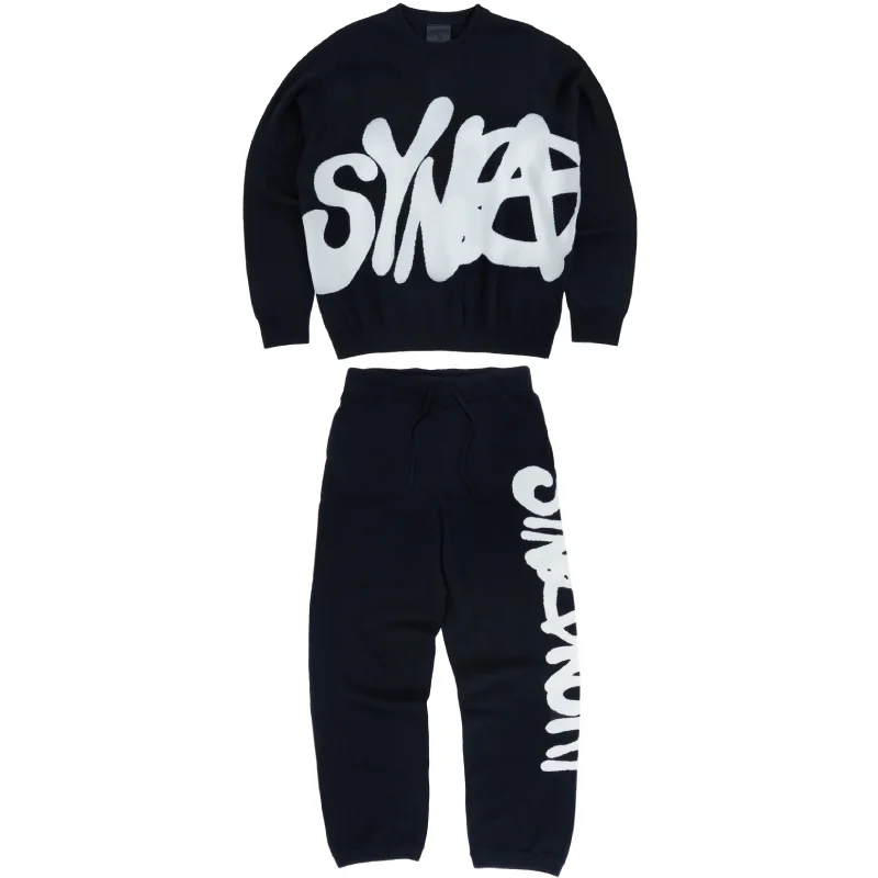 We crafted our Black SYNA World SYNARCHY Cashmere Tracksuit to redefine luxury comfort with streetwear edge. Our tracksuit features a plush cashmere-blend sweater and matching joggers, each with bold intarsia SYNARCHY graphics that speak to our brand’s identity. The knit sweater offers relaxed structure and breathability, while the joggers provide a loose fit, two handy pockets, and effortless movement.