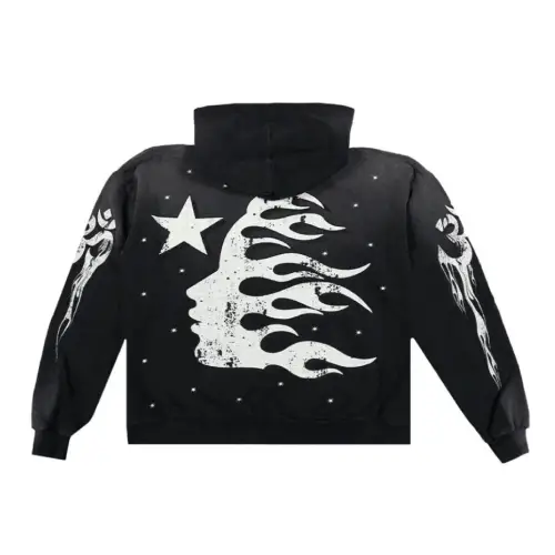 The back showcases a large Hellstar logo, commanding attention wherever you go. Subtle yoga icons on each sleeve add a touch of intrigue, hinting at a deeper meaning. It is made in timeless black and white, this Hellstar sweatshirt exudes a vintage vibe that’s both classic and edgy.