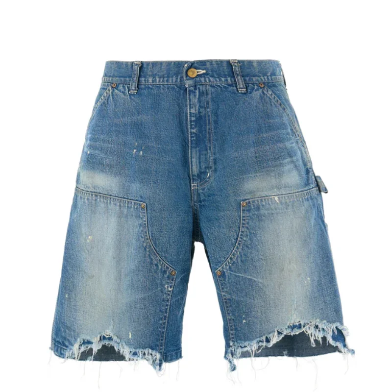 Our Blue Saint Mxxxxxx Denim Double Knee Short is built for raw edge and attitude. We use sturdy denim in a light blue wash, hit with distressed details and paint splatter marks for that worn-in look. Front pockets, side tool pockets, and belt loops keep it functional and ready.