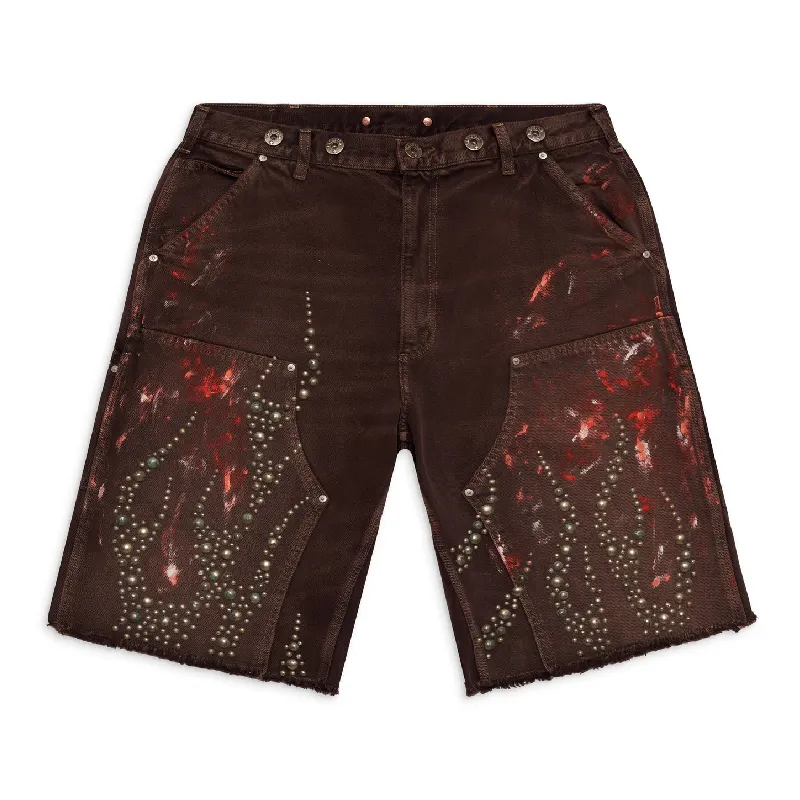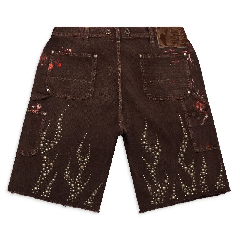 Turn heads with our Brown Hellstar Studded Denim Shorts, a bold addition to your wardrobe. Designed for those who love standout style, these shorts feature premium denim in a warm brown hue, accented by eye-catching stud details. The classic fit ensures comfort and versatility, making them perfect for casual outings or edgy ensembles.