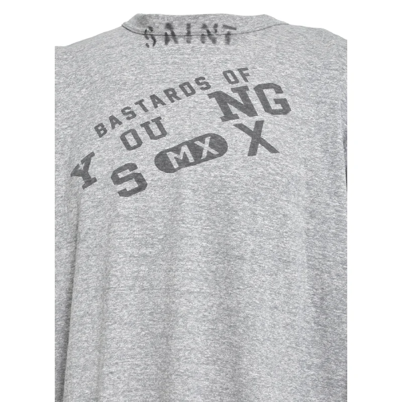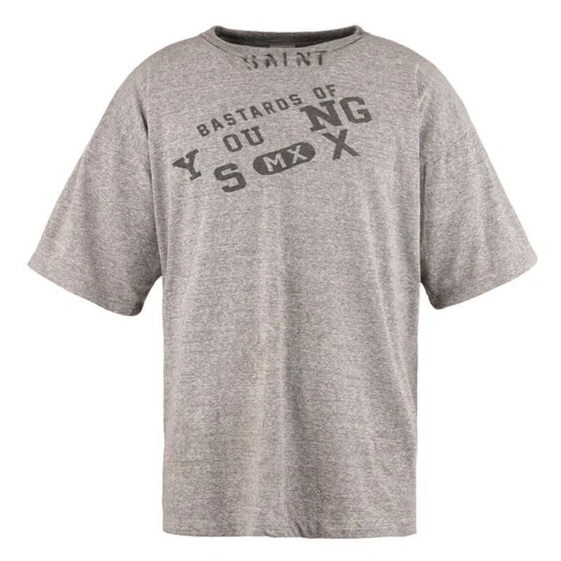The Gray SAINT Mxxxxxx × BerBerJin Young Short Sleeve Tee blends vintage grit with modern style. It is made from heavyweight cotton and finished with a soft vintage wash for a relaxed, oversized fit. The ribbed neck adds subtle structure and durability. The front features a cracked “Bastards of Young” graphic, channeling rebellious youth culture. SAINT branding is printed at the collar for a clean finish. No distressing—just a bold attitude and timeless edge in every stitch.