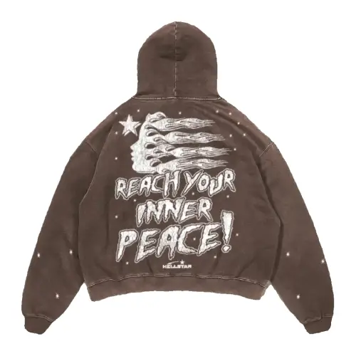 On the back, the Hellstar logo takes center stage, with the phrase “Reach Your Inner Peace” spelled out in a cool and clear font. Choose from black, white, or brown, all accented with long sleeves featuring a subtle white dot pattern. These zip-up hoodies are perfect for anyone who wants to meditate their way to ultimate relaxation.