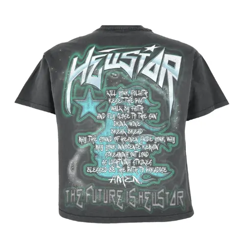 Step into the spotlight with the Black Hellstar Studios The Future T-shirt. This cotton tee showcases a kid sporting striking green goggles on the front, with tiny stars around him. On the back, you’ll find a bold Hellstar logo and the slogan “The Future is Hellstar” in green and starry text. This vibrant short-sleeved shirt is perfect for making a statement and standing out wherever you go.