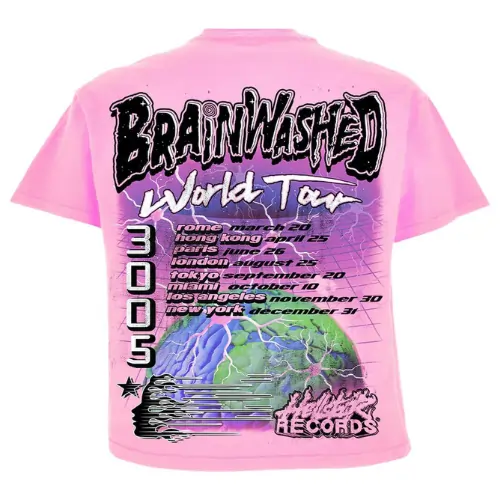 Make a statement with the limited-edition Pink Hellstar Brainwashed World Tour Tee. The front features a bold “Brainwashed World Tour” graphic with a girl in virtual reality goggles. It also displays the year “3005” and Hellstar Records text. On the back, you’ll find the same slogan, year, and world graphic listing city names. This bright pink Hellstar shirt is perfect for fans and will catch their attention.