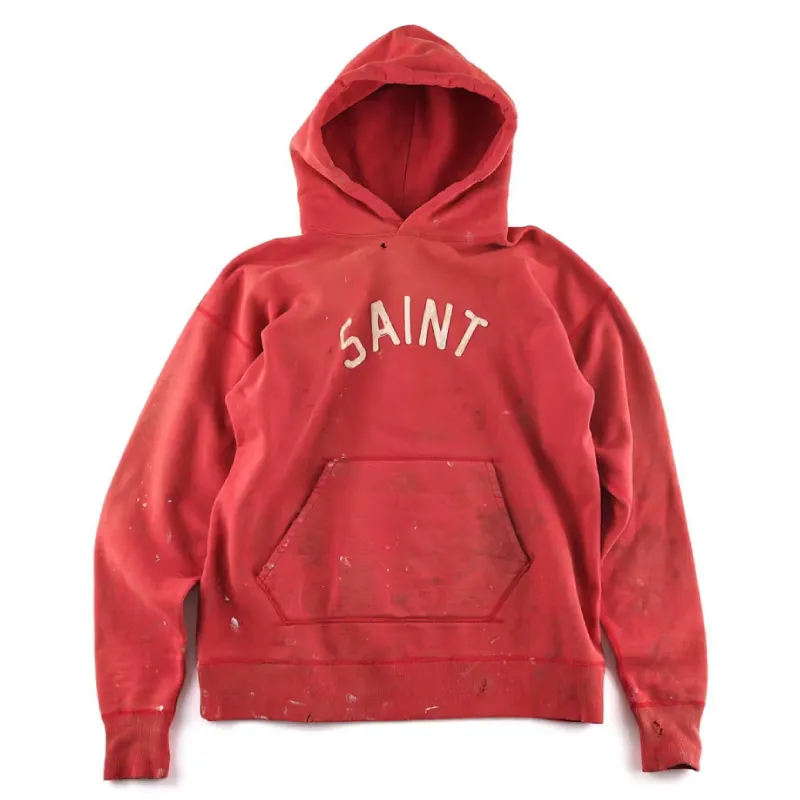 This Red Saint Mxxxxxx No Blood Left Hoodie is crafted from cozy cotton with a vintage wash and hand-applied distressing. It features a bold “SAINT” graphic across the chest and an oversized kangaroo pocket with reinforced stitching for durability. Ribbed cuffs and a structured hem provide a secure fit. On the back, the statement reads: No Blood Left to Drink. Holy Relics of Saint Michael. Each piece is uniquely aged. Built to feel worn. Designed to feel sacred.