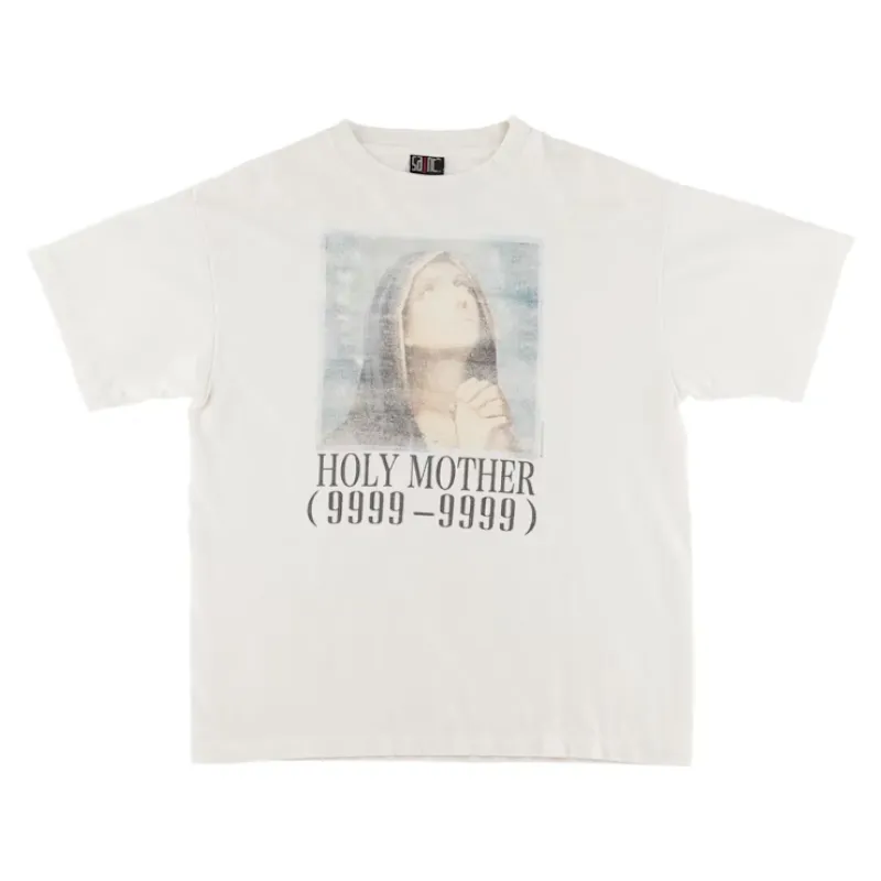 Our White Saint Mxxxxxx Holy Mother Tee stands tall with sacred iconography and street-rooted attitude. The bold “Holy Mother” graphic hits front and back—crisp detailing with nothing unnecessary. Relaxed fit holds shape without feeling baggy, cut from mid-weight cotton for that perfect all-day feel.