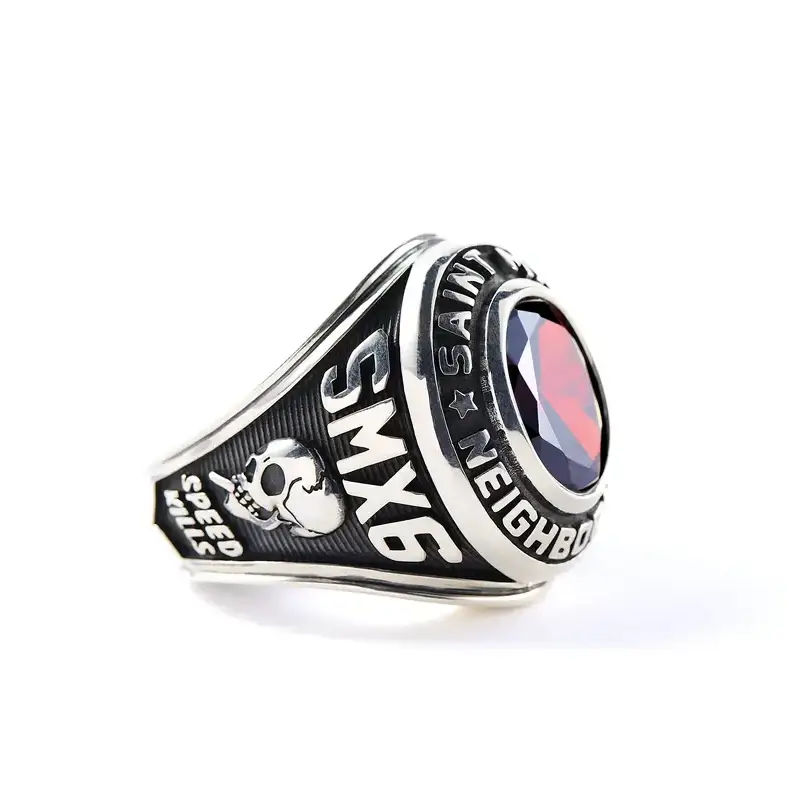 Bring raw presence to your hand with our Silver SAINT Mxxxxxx x Neighborhood STHD Ring. A deep red stone anchors the center, flanked by a sculpted skull face and Speed Kills etched into both sides. Engraved SAINT MX6 and Neighborhood lettering wraps the face like a badge built for the bold. Finished in a silver tone that’s heavy in look and attitude. Whether it’s on daily rotation or saved for moments that matter, this ring doesn’t blend in—it dominates.