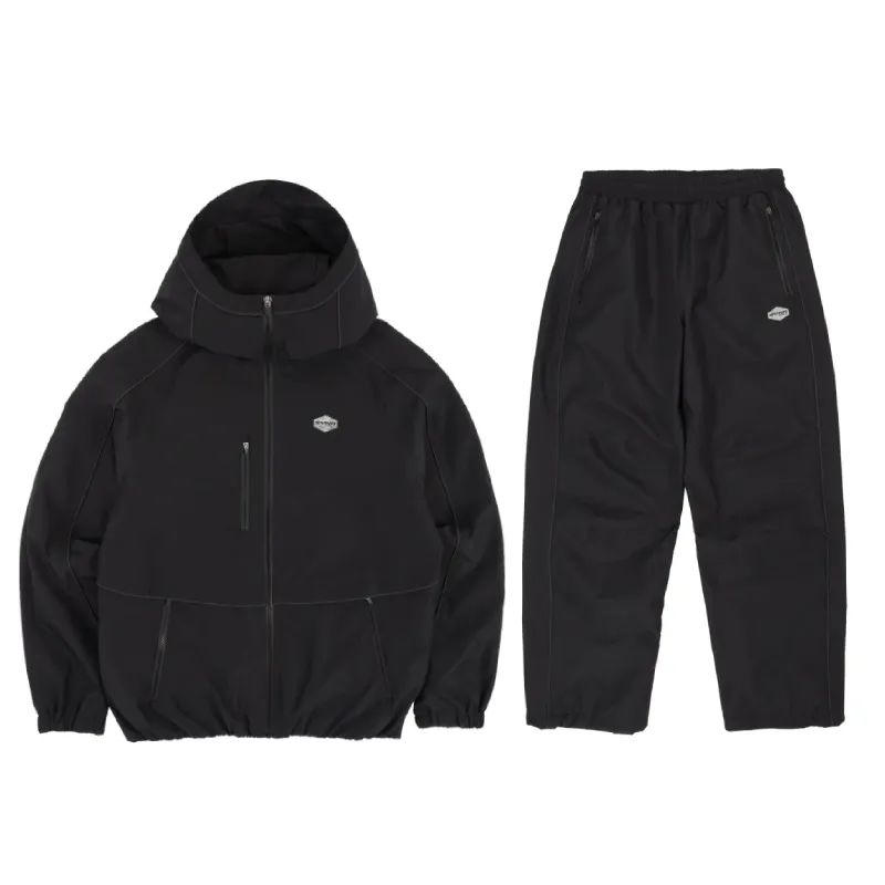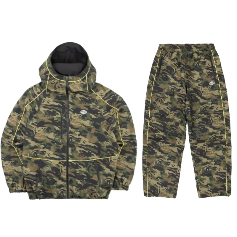 The design includes adjustable bungee drawcords at the hem and waistband for a customizable fit. Functionality is key, featuring zippered pockets and clever hidden stash pockets in both the arm and leg. Finished with reflective graphics and appliqué, this tracksuit, available in Black, Pink, and Camo, delivers on style, utility, and comfort.