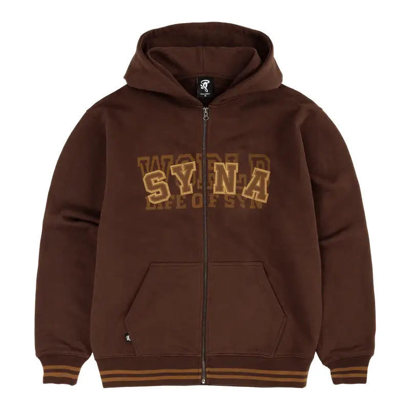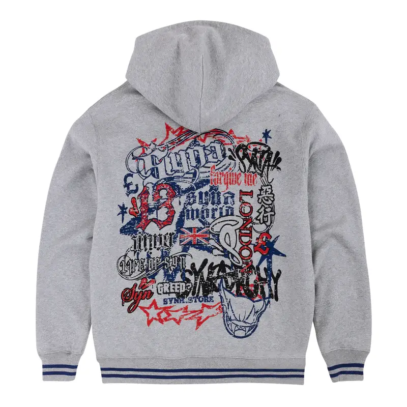 The SYNA World Multi Logo Zip-Up Hoodie combines bold streetwear style with premium comfort. Designed with a boxy fit, this heavyweight hoodie is crafted from 100% cotton (500gsm) for durability and warmth. It features eye-catching prints, intricate embroidery, and soft chenille appliqué for a standout look. Available in versatile grey and brown shades, the hoodie is finished with a satin woven tag for a subtle designer touch.