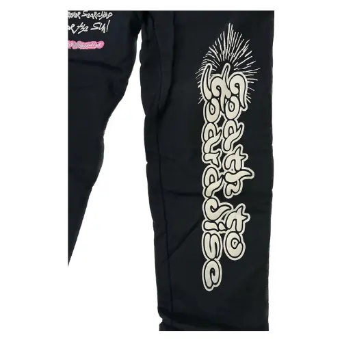 These Unisex Black Hellstar Capsule 7 Sweatpants are perfect for everyday wear. A short Hellstar logo sits above bold “path to paradise” text on the left leg. The right leg showcases a square graphic with a setting sun and the words “Forever searching for the sun.” A bold Hellstar text completes the look. With a relaxed fit and Hellstar’s signature edge, these sweatpants are a must-have for any wardrobe.