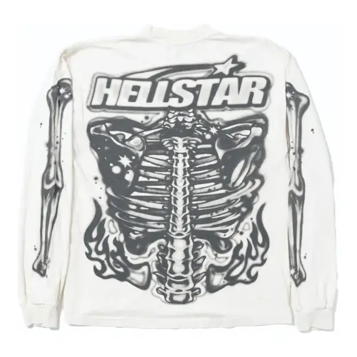 Stand out with the edgy White Hellstar Airbrushed Bones Longsleeve. This long-sleeve features a bold, airbrushed bone graphic on the front and back, with “Hellstar” text underneath. The design continues down the long sleeves for an all-over graphic look. This unique piece is sure to turn heads.