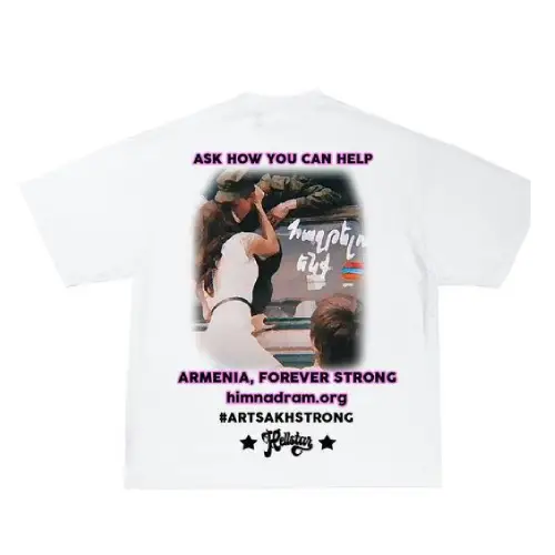 Showcase your love for liberty and Armenian heritage with the White Hellstar Records Statue of Liberty Tee. It features a bold, reimagined Statue of Liberty on the front with purple text. Flip it over to reveal a message of solidarity with Armenia alongside a powerful call to action. It is an essential piece for both casual outings and impactful statements.