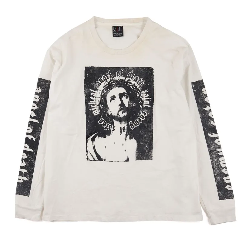 This White Saint Michael Enemy of Satan Long Sleeve Tee makes its presence known. Its front hits with a black and white graphic of a figure like Jesus, circled by bold text. Both sleeves run heavy with distressed prints reading “angel of death” and “enemy of satan.” It’s loud but focused.