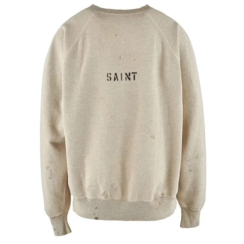 This White SAINT Mxxxxxx x Noritake Kinashi Crewneck Sweatshirt is all about the details. We teamed up with Noritake Kinashi to create an up-front graphic that’s clean but bold. On the back, SAINT is printed loudly and clearly. Grey paint splatters hit all over for a lived-in feel—each one different.